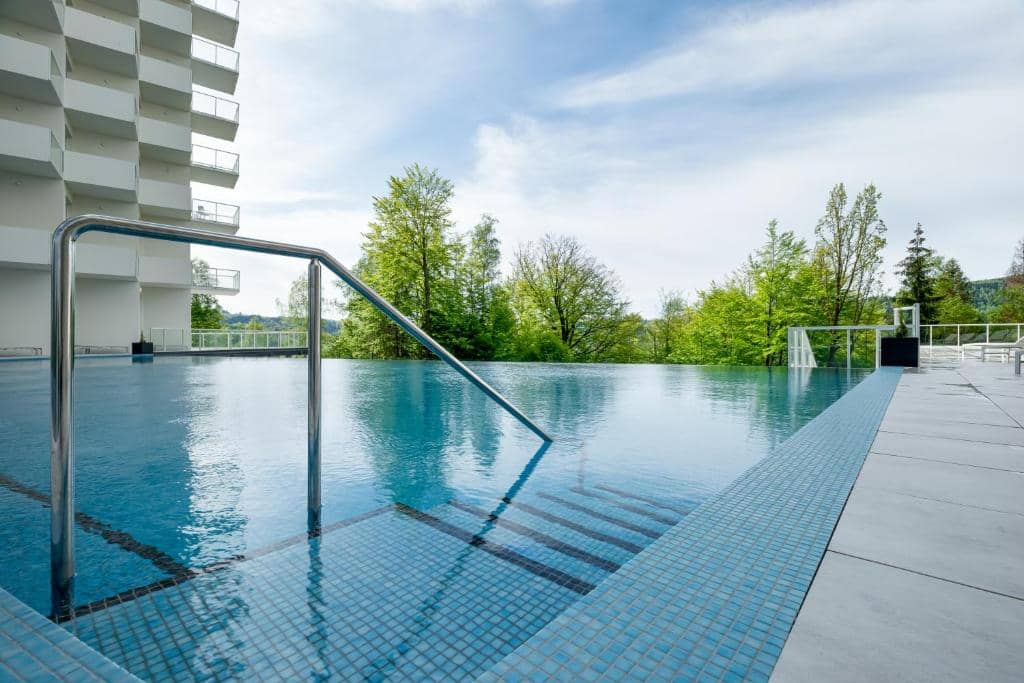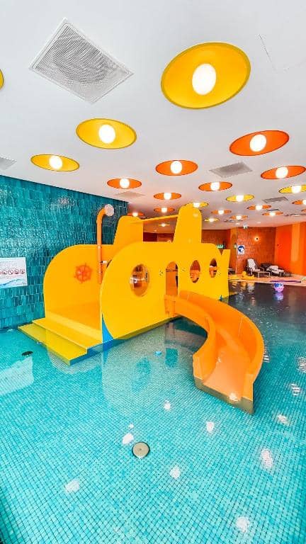 Konkrétně v něm najdete rekreační bazén s různými vodními prvky vhodný pro nejrůznější vodní aktivity včetně rodinné zábavy. Dále je součástí aquaparku 24metrový vnitřní plavecký bazén s dráhami pro kondiční plavání přístupný od 16 let a nechybí ani venkovní „nekonečný“ bazén s nádhernými výhledy a slunnými terasami s lehátky pro perfektní relaxaci. Nechybí dále ani brouzdaliště pro děti a bazény doplňují vířivky a taky tobogány. Je zde tedy vše, co by měl správný aquapark mít.