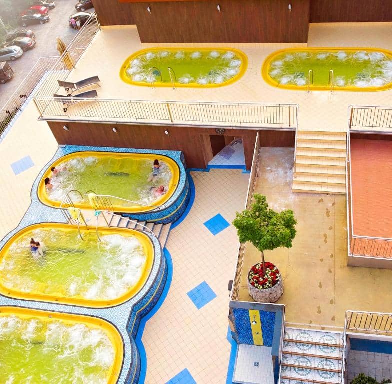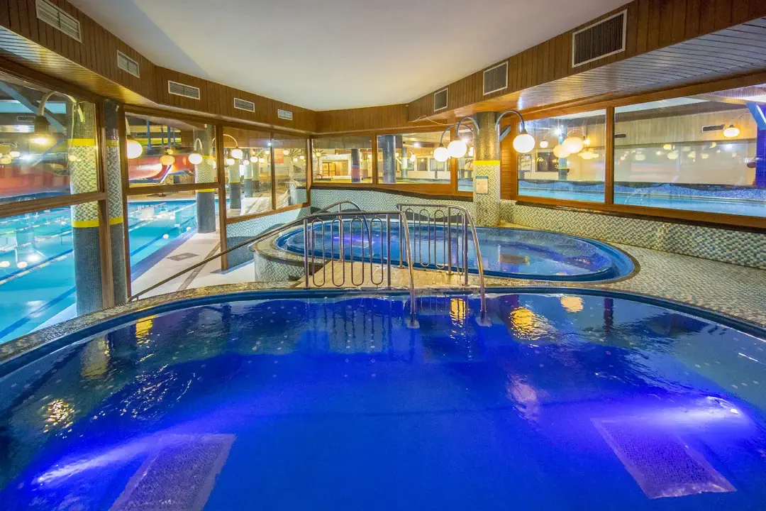 Parádní záležitostí a klenotem wellness vybavení jsou pak vnitřní vířivky a léčivé koupele. Těch zde najdete celkem 8. Dále 6 venkovních vířivek – z nich mají 3 celoroční provoz. Často jde o poměrně velkokapacitní bazény, nikoli jen malé „vany“. K dispozici je například vápníko-hořčíková koupel, koupel s mořskou solí atd. Milovníci vířivek a léčivých koupelí tak budou nepochybně nadšení.