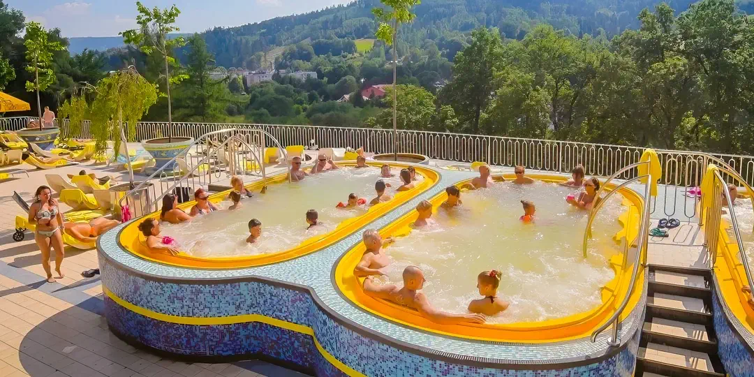 Venkovní bazény jsou otevřeny v letní sezóně. Situované jsou na rozlehlé hotelové terase, která poskytuje nádherné výhledy do okolí. Aquapark nabízí i řadu atrakcí. Jsou zde vnitřní i venkovní tobogány či menší skluzavky, zmíněné umělé vlnobití, vyzkoušet můžete třeba i aqua zorbing i leccos dalšího.