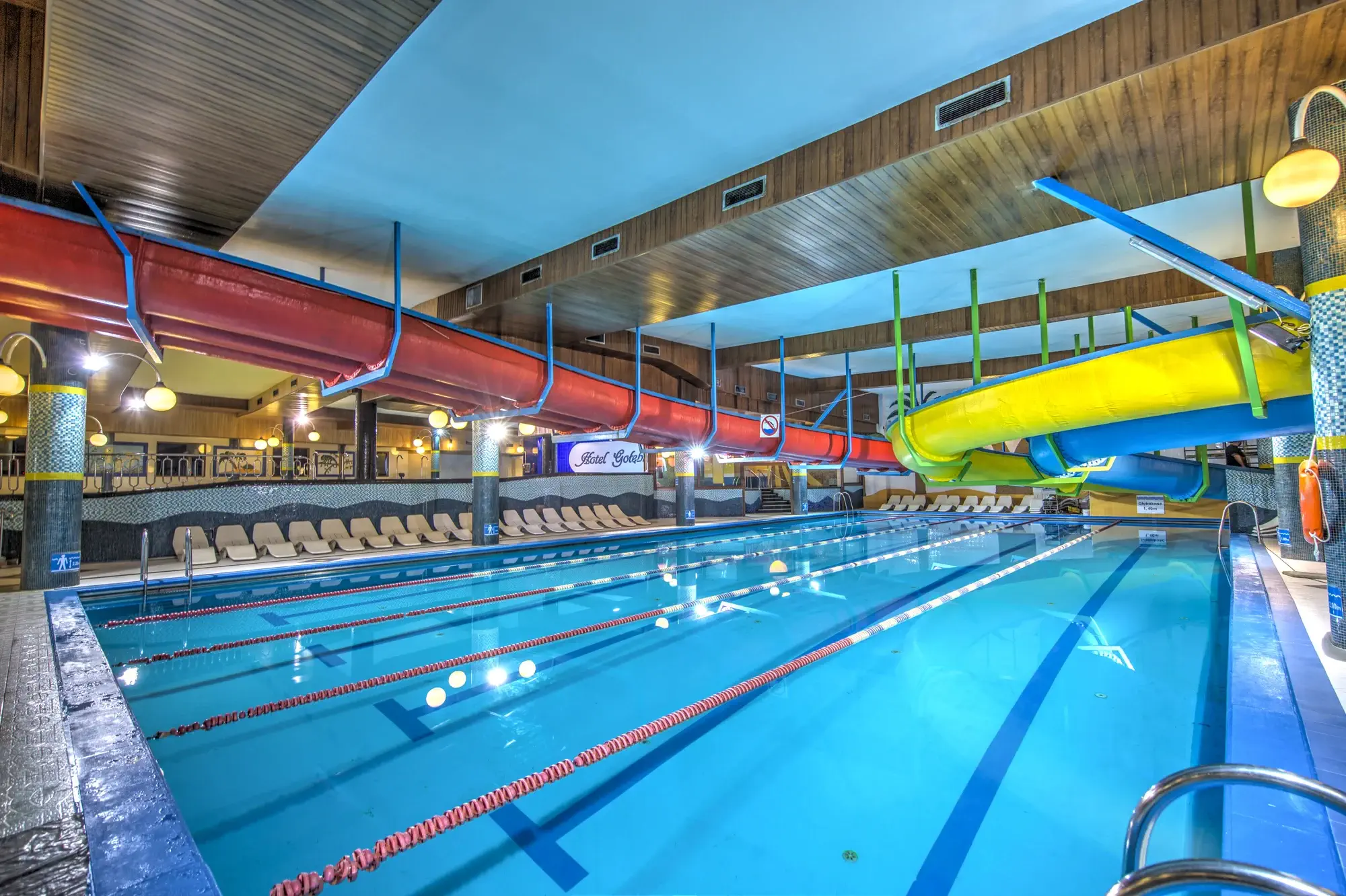 - Vnitřní plavecký bazén o délce 25 metrů s 5 plaveckými dráhami