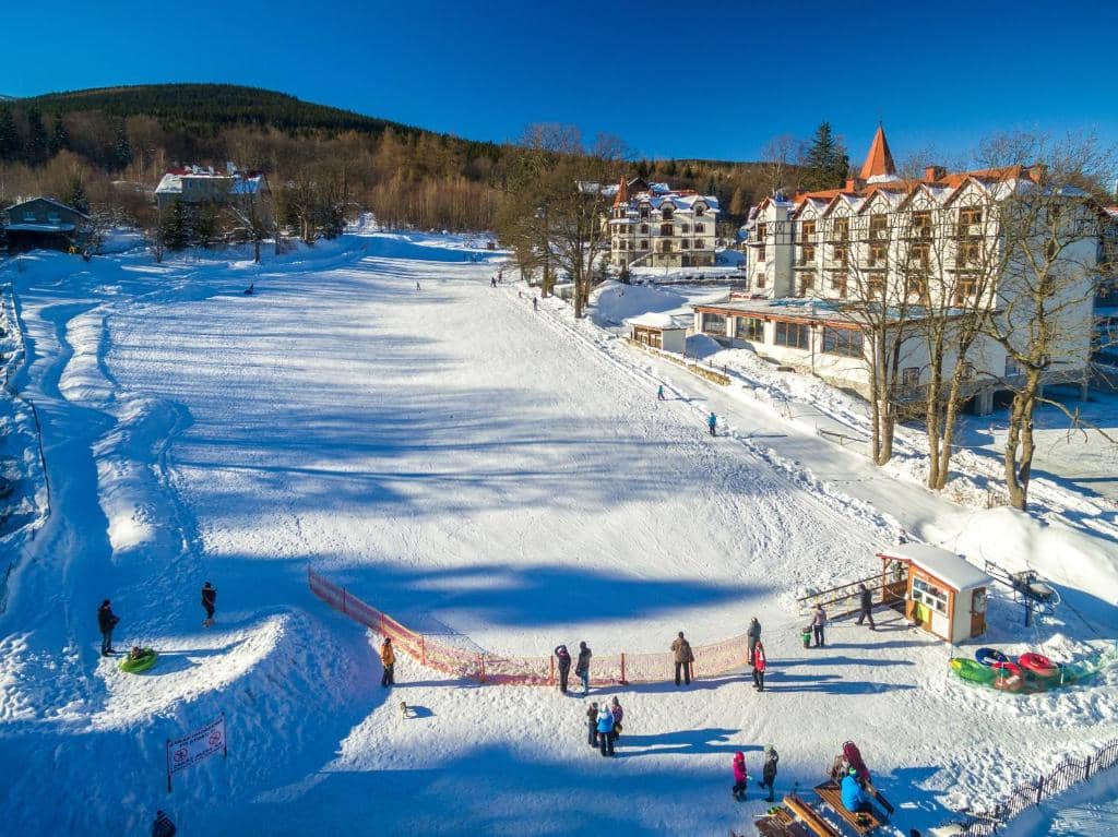 Větší ski areál Świeradów-Zdrój najdete pak jen cca něco přes 1 km daleko od hotelu. Zde už jsou i dlouhé sjezdovky, především tedy jedna červená 2,5 km dlouhá sjezdovka, která patří k nejdelším v Polsku i střední Evropě.