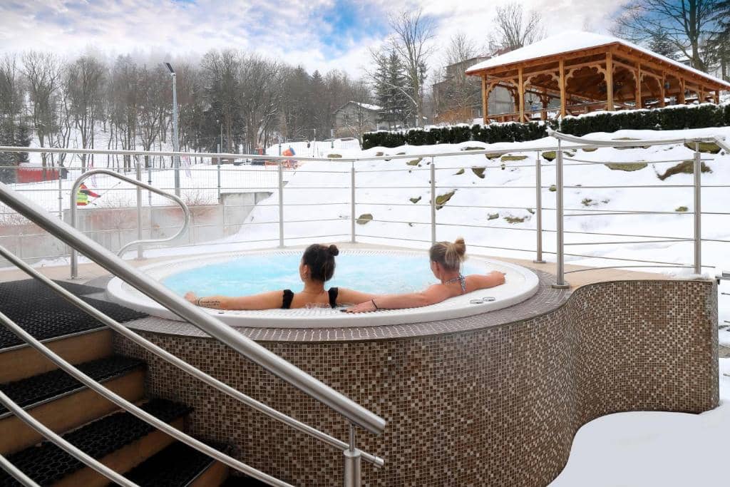 Skvělou záležitostí je pak i venkovní vířivka, kterou najdete před sálem s bazénem. Vířivka nabízí výhled přímo na sjezdovku a díky teplotě 36 °C se v ní můžete krásně ohřívat, i když venku mrzne až praští. Tato vířivka je otevřená od 12 do 21 hodin denně, takže v zimním období se můžete koupat i pod hvězdným nebem.