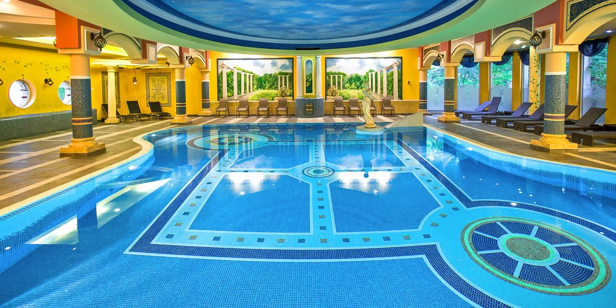 Ve zdobné orientální místnosti se zdobnými sloupovími se nacházejí i lázně s bazénem a relaxačními prostory s lehátky okolo. Bazén má 12 × 9 m a vybavený je i protiproudem pro kondiční plavání. Součástí lázní je i skvělá vířivka s hydromasážemi určená až pro 7 osob.