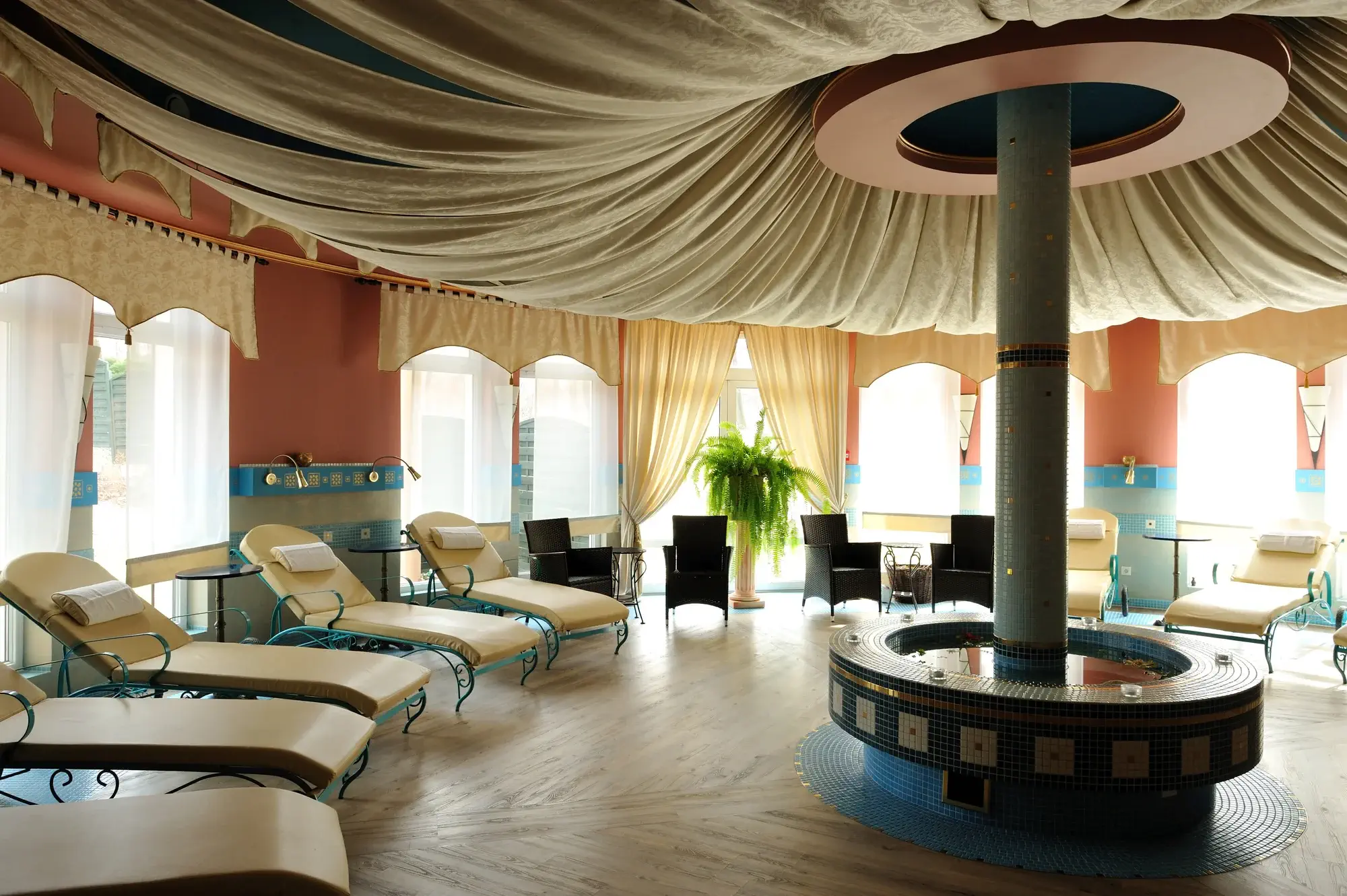 Odpočívat můžete i v tepidáriu tedy ohřívárně vybavené ohřívacími lampami a luxusními lehátky.